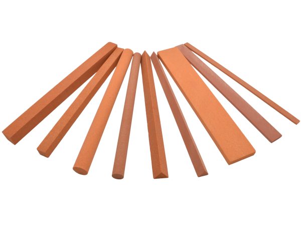 Our EDM stones come in five shapes: Flat, Square, Round, Half-Round, and Triangular. Each shape is available in multiple sizes and six grit options: 120, 180, 220, 320, 400, and 600. Most stones are 6” long, except some small stones (1/8” & 5/32”) which are 4” long.